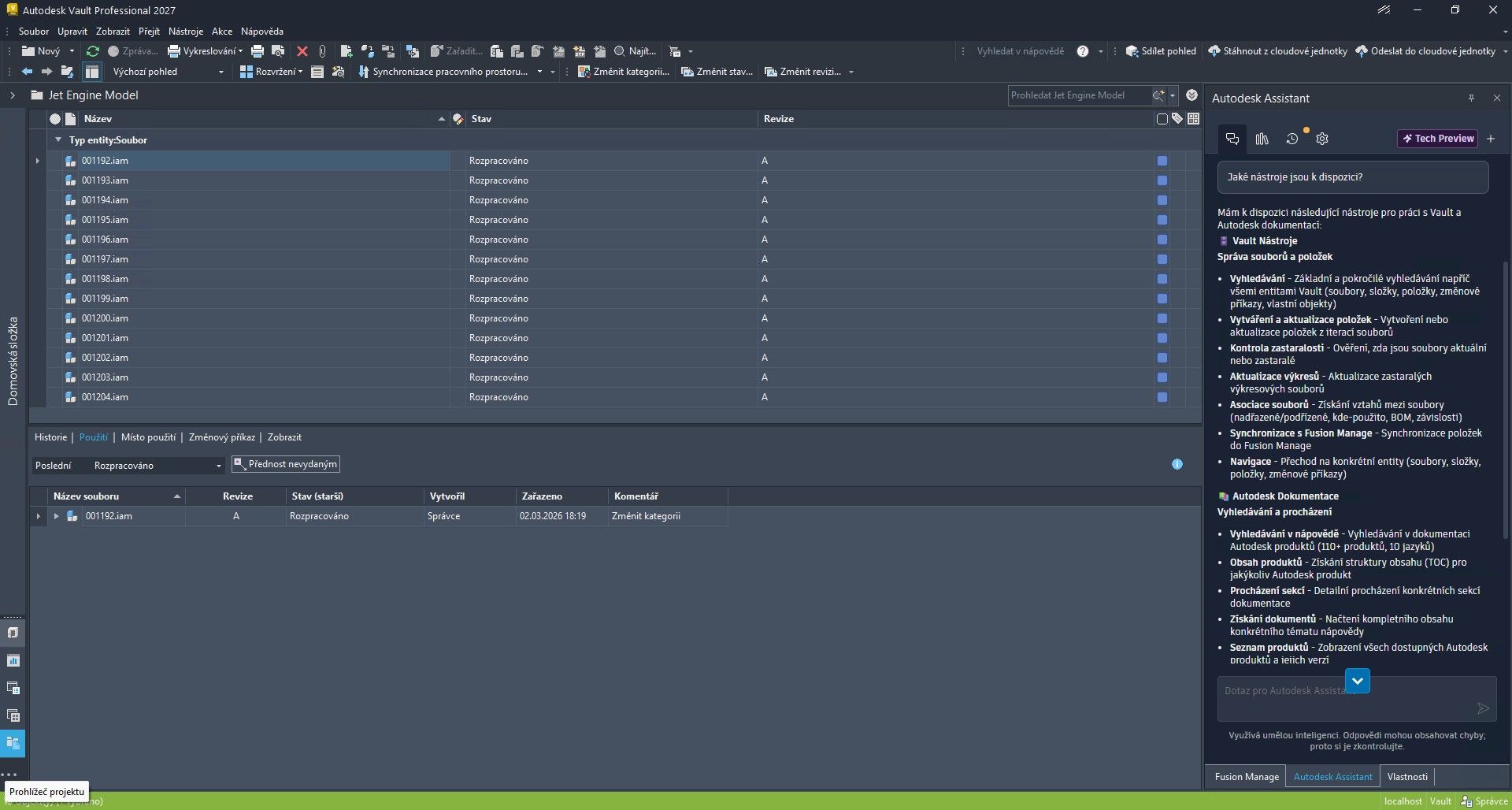 AI nástroj Autodesk Assistant poskytuje inteligentní podporu při práci ve Vaultu, pomáhá rychle vyhledávat informace, automatizovat rutinní úlohy a získat kontextové pokyny. Díky porozumění přirozenému jazyku můžete klást otázky týkající se vašich dat, přijímat návrhy na doporučené postupy a zjednodušit si každodenní provoz (např. "Aktualizuj všechny zastaralé výkresy v tomto projektu"). Vault zůstává základem pro řízená konstrukční data, podporuje bezpečnou a strukturovanou správu dat v průběhu celého životního cyklu produktu a připravuje organizace na pokročilejší automatizaci založenou na umělé inteligenci.